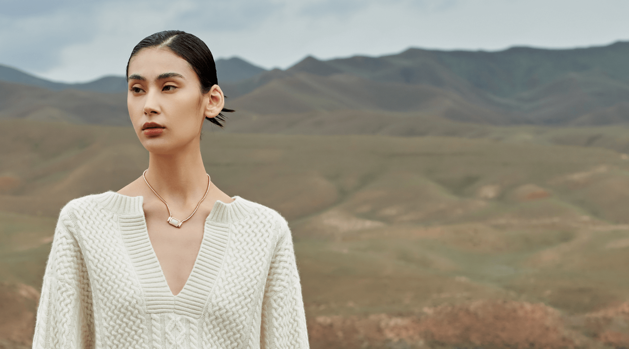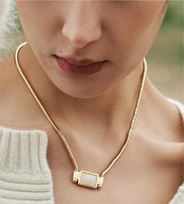 A Whisper of Mutton-Fat Jade. Silky faux jade squares framed by satin-finish gold, sculpted for timeless radiance at your neckline.